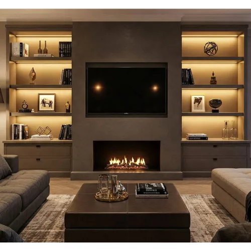 Complex Designs: Larger media walls with bespoke shelving, integrated lighting, hidden storage, and additional features like electric fireplaces or sound systems will increase costs due to the added materials, labour, and planning required
